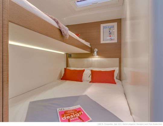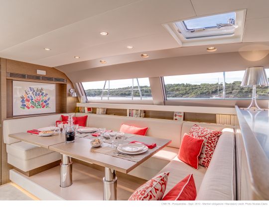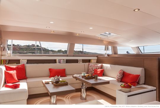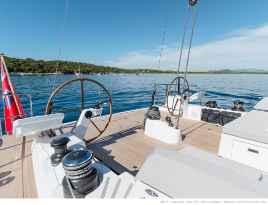 Le CNB 76 possède des lignes contemporaines et simples qui lui confèrent une silhouette élégante. Ce voilier du 21ème siècle est inspiré de l'élégance à la française et sa décoration intérieure est raffinée, classique, innovante, confortable, élégante et contemporaine. Le design intérieur a été réalisé par Jean-Marc Piaton. À l'avant du bateau, le cockpit est séparé de la zone de manœuvre et est équipé d'une table à deux positions, pouvant servir de coin repas ou de bain de soleil. Un bimini escamotable vient protéger cette partie en cas d'intempéries ou de fortes chaleurs.