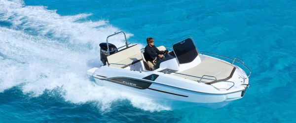 Dernier né dans la gamme, le Flyer 5 est le plus petit de trois modèles. Il reprend les codes qui caractérisent désormais ces bateaux à savoir l'étrave très ronde au design automobile et la carène Air Step déposée par Bénéteau.