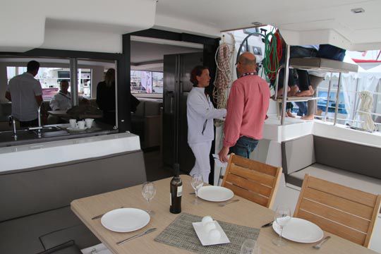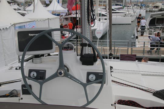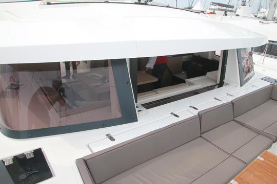 C'est sur l'emplacement du poste de barre qui change tout entre les deux bateaux. Pas seulement pour la place du skipper/capitaine, mais sur l'organisation à bord. Sur le 4.3, la barre est installée au-dessus du rouf. Les manœuvres reviennent directement du pied de mât devant le barreur qui a une vision totale sur tout le bateau sauf un peu vers l'arrière qui reste masqué par le rouf. Les manœuvres de port en seront facilitées et en navigation sous voile, on peut garder un œil sur les réglages. Cette disposition libère entièrement le dessous au niveau du pont. L'architecte a donc pu imaginer un espace unique qui se ferme à l'aide d'une grande porte rigide (rangée sous le toit en position ouverte). Cet énorme bloc cloison/porte se manœuvre à l'aide un moteur électrique. Facile ! Sur les côtés, des panneaux vitrés coulissants assurent la fermeture. Ainsi en 2 minutes, le cockpit qui était ouvert, se retrouve partie intégrante du rouf.