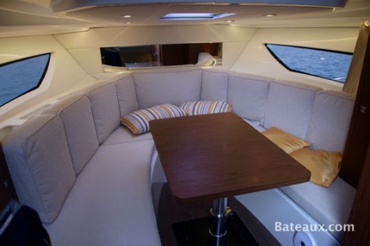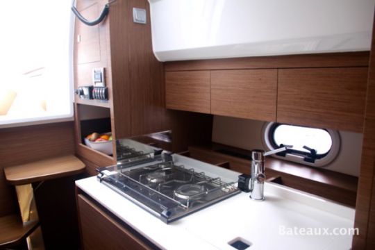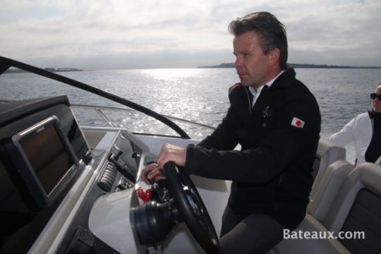 On accède à bord de plusieurs manières. Soit par la plateforme de bain tribord, de plain-pied avec le cockpit, soit par la porte latérale de coupé qui permet d'y accéder depuis un quai et qui débouche sur le passavant tribord encastré sécurisé, pour accéder à l'avant du bateau. Enfin, on peut monter à bord par le balcon avant ouvert, auquel viendra s'ajouter (en option) une delphinière pour pouvoir accrocher une échelle de bain.