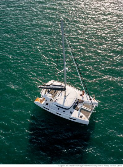 Pour autant, le constructeur ne s'en laisse pas compter quant à ses ambitions en matière de performances. Un speed test a même été organisé entre le 450 et le 46 afin de valider le gréement du nouveau modèle. Pas question bien sûr que le nouveau modèle soit à la traîne de l'ancien. Le chantier a donc conservé son mât reculé – décliné sur tous les modèles depuis 2012 avec le Lagoon 39 -, mais le profil est également particulièrement élancé. Le foc autovireur affiche ainsi une surface respectable. La grand-voile affiche un profil très soigné sur le plan aérodynamique avec une corne. Cette configuration GV plus solent ne parvient pas à donner des ailes par petit temps au 46 – pas plus de 5 nœuds au près (50 à 55° du vent) par 10 nœuds de vent réel.