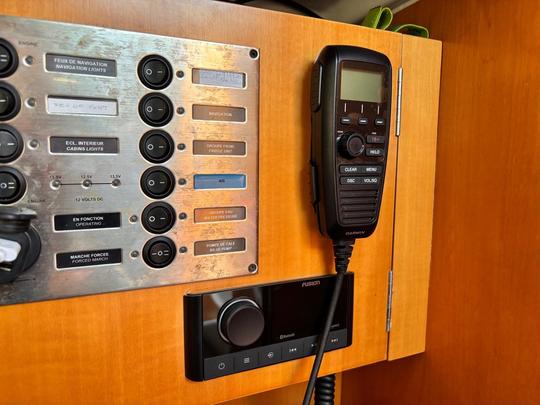 La sécurité n'a pas été négligée : la VHF315i (en boîte noire) est couplée à un combiné et un haut-parleur dans le cockpit, et à un module AIS. Ce système permet à l'équipage de suivre les procédures de départ sans interférences et d'assurer une veille efficace en navigation.