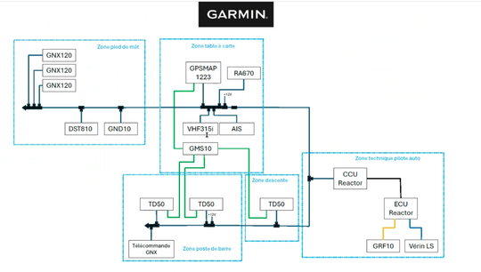 La nouvelle configuration repose sur un réseau NMEA 2000 complet. À la table à carte, un GPSMAP 1223 (traceur multifonction 12 pouces) centralise les données de navigation. Il dialogue avec une girouette-anémomètre GND10 et une sonde DST810 (profondeur, vitesse, température).