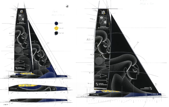 Près de 2 000 m2 de surface peinte ont été confiés aux frères Quistrebert, figures de la scène contemporaine française, pour traduire visuellement l'identité de Gitana 18. Inspirée de visages symboliques, cette fresque pointilliste, en noir et blanc, mêle une approche quasi abstraite aux défis techniques d'un voilier volant.