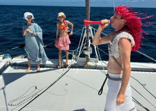 Comme le veut la coutume, les "pollywogs" (ceux qui n'ont encore jamais passé la ligne) ont été présentés aux dieux marins dans une mise en scène joyeuse et créative. Habillés de costumes décalés - serpillières en guise de jupes, parapluies sur la tête, lunettes démesurées et maquillage - les membres de l'équipage ont tour à tour fait leurs offrandes : messages à la mer, objets métalliques, nourriture faite maison ou encore un oiseau tressé en feuille de cocotier.