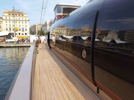 Le dessin extérieur du Artexplorer frappe d'emblée : des superstructures vitrées à la courbure futuriste cohabitent avec des éléments en acajou brillamment vernis, témoins d'une volonté de dialogue entre tradition nautique et architecture contemporaine. Le plus grand catamaran aluminium au monde en impose, et cache bien ses mensurations hors normes.