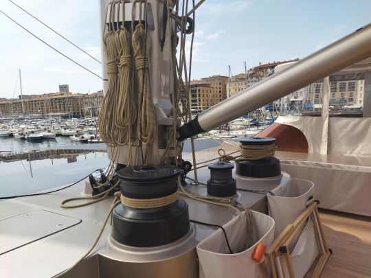 Le mât aile de 50 mètres fabriqué par Lorima peut supporter 1215 m2 de surface de voile et propulse l'ensemble à 12 nœuds dans 15 nœuds de vent réel, sans assistance moteur. L'énergie est complétée par un ensemble photovoltaïque de 65 mètres carrés produisant jusqu'à 200 kWh/jour.