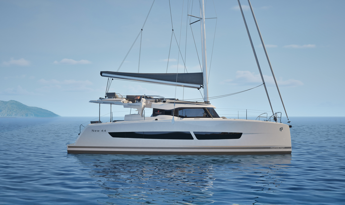 Derrière la silhouette familière du New 44, le cabinet Berret-Racoupeau introduit des évolutions discrètes mais ciblées. Le tirant d'eau reste modeste avec 1,38 m, mais la carène présente un redan allongé au-dessus de la flottaison. Ce trait de carène, associé à une tonture inversée, révèle une recherche d'équilibre dynamique tout en favorisant la réduction de traînée hydrodynamique.