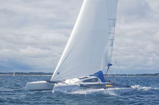 Fruit de la cinquième collaboration avec VPLP design, ce trimaran conjugue transportabilité et programme de croisière. Ses dimensions et son aménagement en font un bateau pensé pour la navigation côtière en équipage réduit.