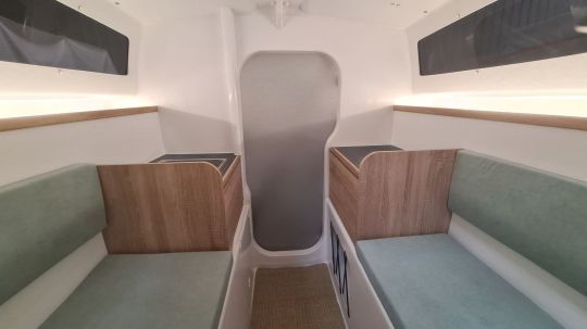 Construit en infusion polyester, le trimaran affiche un déplacement lège de 1 100 à 1 150 kg selon les versions. Il est homologué en catégorie C pour 5 personnes et D pour 7. La motorisation hors-bord maximale est de 10 chevaux, suffisante pour les manœuvres portuaires et les approches de mouillage.