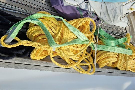 La sangle sur enrouleur est appréciée pour son encombrement réduit et sa rapidité de mise en place. L'enrouleur installé dans le balcon arrière est toujours à poste. La sangle se déroule facilement (à condition de tirer dans l'axe de l'enrouleur) et permet de saisir rapidement un rocher. Mais plusieurs navigateurs soulignent ses limites : elle coule, elle bat bruyamment au vent et reste difficile à larguer sous tension (nœud de taquet difficle à défaire).