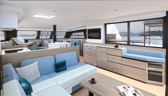 La première version plaçait le barreur dans une position isolée, avec peu de contact avec l'intérieur. Cette disposition surprenante pour un catamaran de voyage a montré ses limites en équipage réduit quand le barreur est isolé. La configuration, avec une baie vitrée qui s'ouvre sur le carré rapproche l'homme de veille à la barre, du carré et améliore la communication.