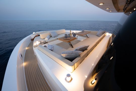 L'organisation du pont met en avant deux zones distinctes : un salon avant convertible en bain de soleil ou jacuzzi, et un arrière conçu pour combiner repas et détente. La plateforme de bain hydraulique, rare sur un bateau à moteurs hors-bord, facilite la mise à l'eau d'une annexe et sécurise l'accès à la mer. Le grand coffre arrière prévu pour l'annexe ou du matériel de plongée traduit un effort d'optimisation des volumes techniques, d'autant plus sur une unité équipée de quatre hors-bord.