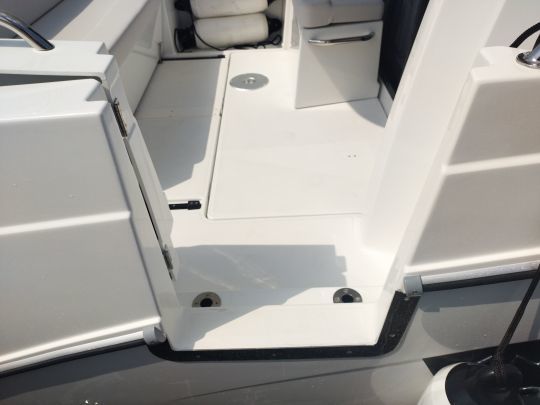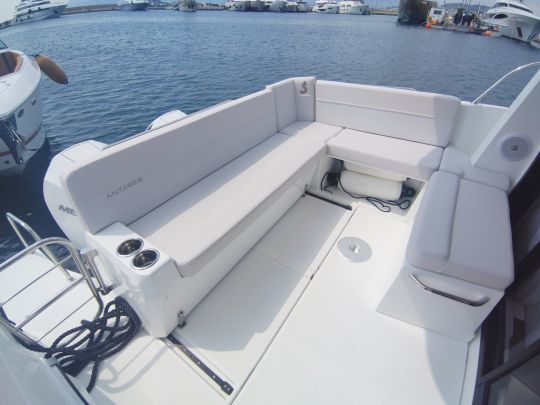 Le cockpit de l'Antarès 9 illustre bien la volonté du chantier de rendre le bateau modulable. La banquette arrière coulissante, montée sur rails, permet de libérer l'espace nécessaire pour le relevage complet des moteurs hors-bord. Ce système offre également la possibilité de créer un carré en U grâce à deux assises latérales amovibles, formant ainsi un coin repas convivial.