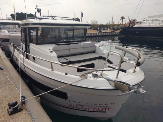 Jeanneau Merry Fisher 895 : concurrent naturel. Longueur 8,90 m, largeur 2,99 m, deux cabines, double motorisation jusqu'à 2 x 200 ch. Tarif catalogue similaire, mais équipements moindres de série.