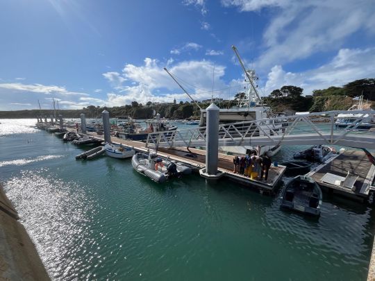 L'un des éléments structurants du chantier concerne la mise en place d'une panne flottante de 140 mètres, s'amarrant sur 11 pieux métalliques. Cette configuration améliore la stabilité de l'ensemble face à la houle résiduelle et aux mouvements de mer fréquents dans ce secteur de la côte sud bretonne. Conçu pour accueillir jusqu'à 40 unités, ce ponton améliore nettement les conditions d'amarrage dans un port précédemment dominé par des mouillages à l'embossage.