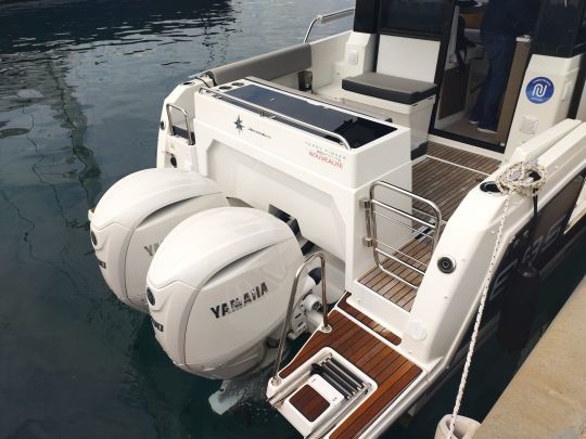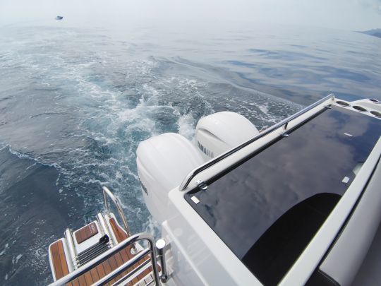 Avec cinq personnes à bord, l'essai se veut représentatif d'un programme de croisière à la journée ou de sortie pêche sportive. Notre modèle d'essai est équipé de 2 x 200 ch Yamaha V6, couplés au système steer-by-wire, offre une belle occasion d'analyser les rendements, la tenue de cap, et la réactivité à la barre.