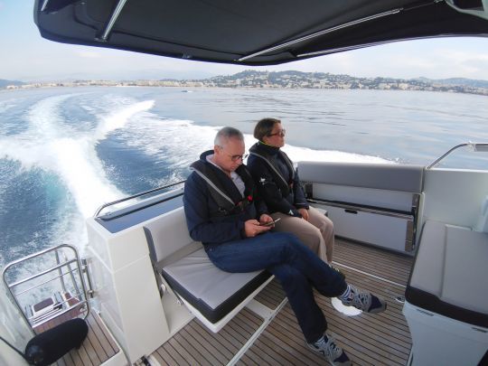 Afin de tester la vitesse maximale, nous allons nous abriter derrière les îles de Lérins, où le plan d'eau est plus calme. Au régime maximal de 6 000 tr/min, le bateau atteint 34 nœuds, avec une consommation de 156 litres/heure. L'assiette reste maîtrisée à condition d'ajuster finement le trim. Ces performances permettent d'envisager des navigations dynamiques, mais au prix d'une consommation soutenue.
