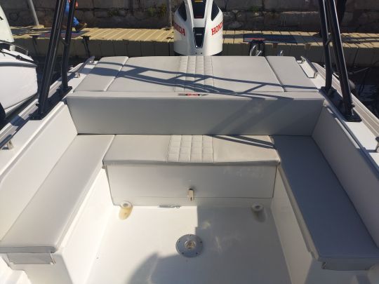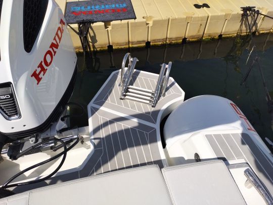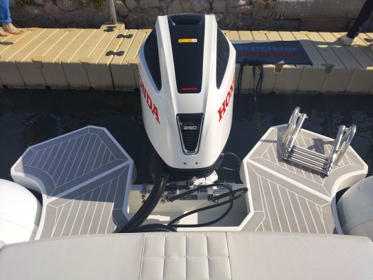 À l'arrière, la plateforme de bain encadre le moteur hors-bord. On y trouve une échelle de bain en inox sur bâbord ainsi qu'une douchette alimentée par un réservoir de 80 litres, équipement rarement disponible sur des semi-rigides de ce gabarit. Cet aménagement répond directement aux programmes de baignade et de sports nautiques.