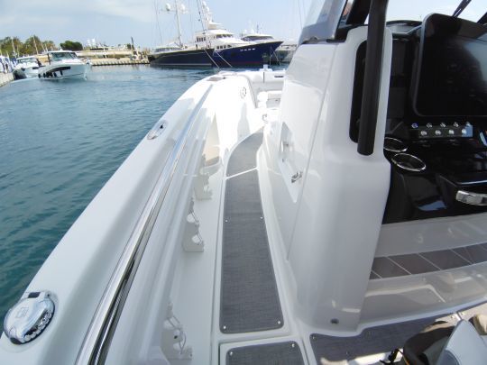 Les deux passavants latéraux, larges et bien sécurisés, permettent un accès facile vers la zone avant. On y retrouve des logements pour cannes à pêche et des mains courantes pour assurer une progression sécurisée en navigation. Ces détails, souvent négligés sur des modèles plus orientés vers le farniente, démontrent que le Wellcraft 38 T-Top conserve une orientation technique, fidèle à sa vocation sportive.