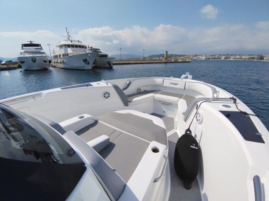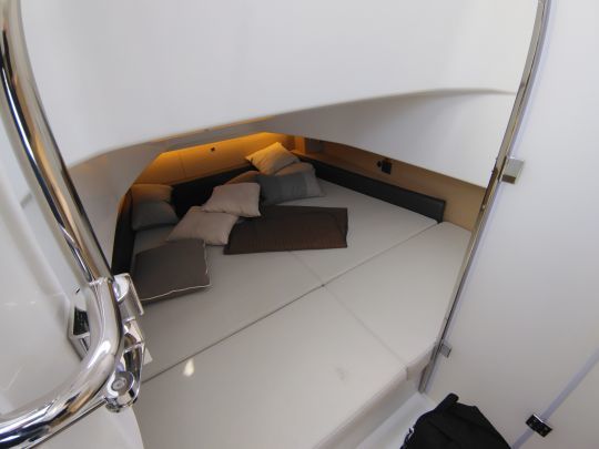 Derrière la console, une porte discrète ouvre sur une cabine étonnamment spacieuse pour un centre-console. On y trouve une couchette double de bonne taille ainsi qu'une salle d'eau équipée de WC et d'un espace douche. Si elle ne rivalise pas avec les cabines de timoniers ou de day-cruisers, elle permet néanmoins d'envisager des nuits à bord, notamment lors de croisières rapides le long des côtes méditerranéennes. L'éclairage LED et le soin apporté aux matériaux renforcent le confort et rappellent l'influence du design italien de Camillo Garroni.