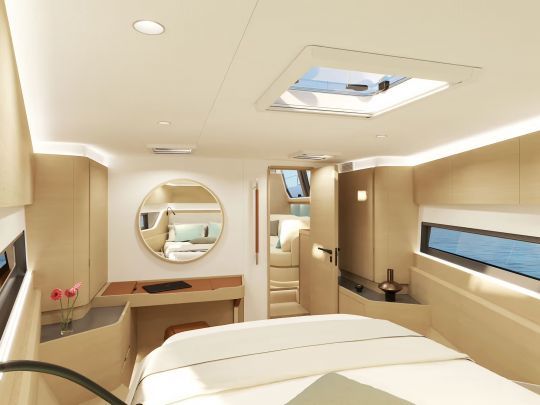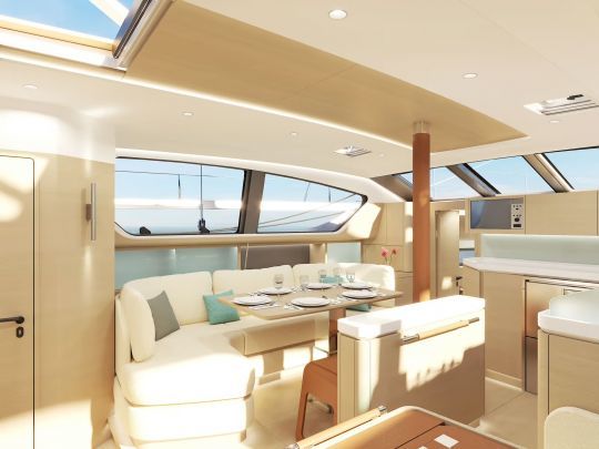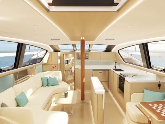 Un îlot central structure l'espace et offre des appuis en navigation. La table à cartes reste, comme sur tous les modèles Allures, convertible en bureau ou espace de détente, tandis que plusieurs versions d'aménagement permettent de choisir entre deux ou trois cabines. Les boiseries chaudes, selleries épaisses et éclairages indirects renforcent le confort de vie en grande croisière.