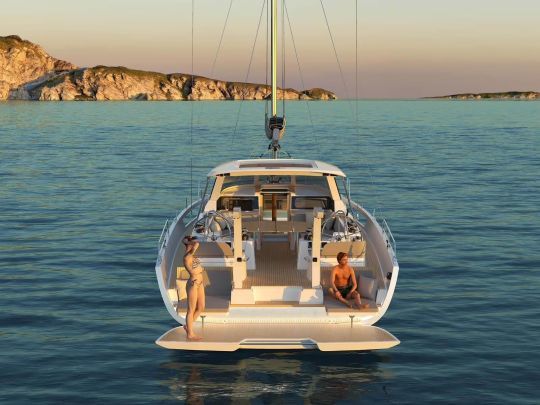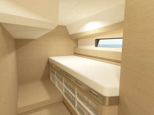 Le chantier inaugure une motorisation Nanni de 80 ch, associée à un réservoir de 650 l de gasoil. L'autonomie en eau douce atteint 500 l. À l'arrière, un vaste volume technique accueille le matériel nautique (plongée, paddle, entretien du bord). La plateforme arrière modulable s'ouvre sur la mer pour faciliter les activités au mouillage.