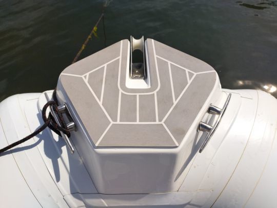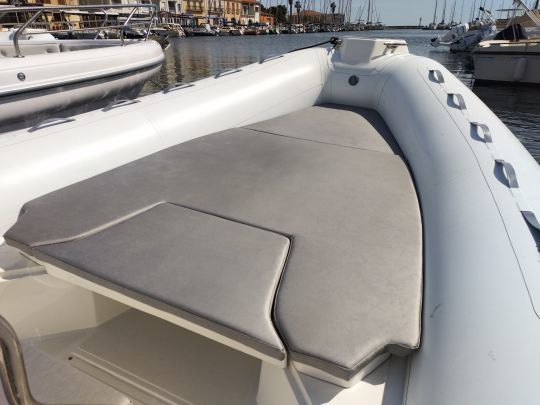 L'avant du bateau est entièrement dédié au farniente. Un solarium de 2 mètres permet à deux adultes de s'allonger confortablement, une performance sur ce gabarit. L'arrière n'est pas en reste : le deuxième bain de soleil, d'1,50 mètre de long, peut accueillir deux personnes supplémentaires. Ces espaces répondent directement aux attentes d'une clientèle méditerranéenne ou de la façade Atlantique, habituée aux longues journées en mer rythmées par les bains de soleil et les baignades.