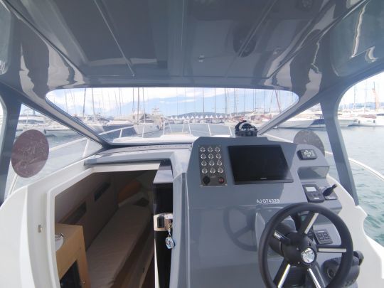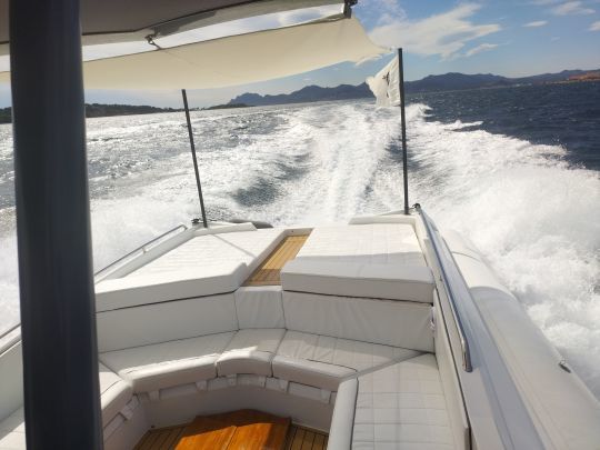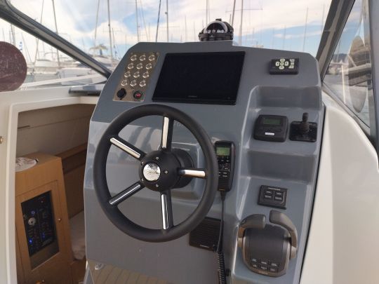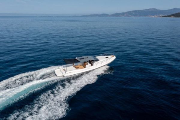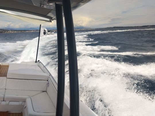 La motorisation de 800 chevaux en Z-drive apportent un grand confort au moment de mettre les gaz. Si les deux Volvo n'apportent pas le caractère sportif que pourrait offrir un équivalent en hors-bord, elle confirme le tempérament "cruising" du Maio 1400. Le bateau se cale rapidement sur son assiette, sans effet de cabrage exagéré. L'étrave fend la houle avec autorité, démontrant un excellent passage dans la vague.