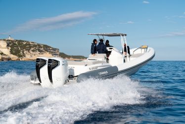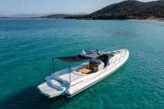 Avec près de 3,63 m de largeur, le Libecciu 1000 présente une allure solide et bien assise sur l'eau. Ses flotteurs offrent une ligne ascendante qui allège visuellement la silhouette tout en renforçant la protection du pont.