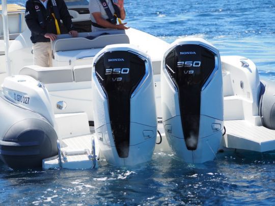 Notre unité d'essai est motorisée avec deux V8 Honda 350 chevaux. Pleins faits, 3 personnes à bord et un antifouling propre sur la carène : un scénario proche d'un usage réel.