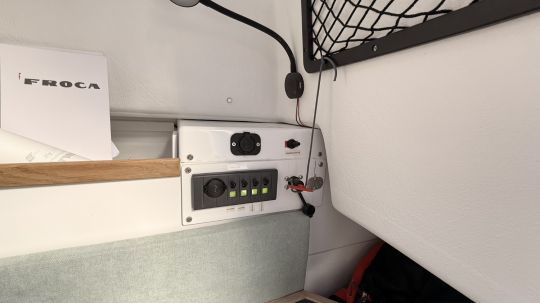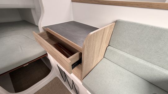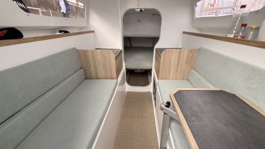 Le volume intérieur du 26.5 constitue une avancée notable dans la gamme. La cabine avant, séparée par une toile, propose une couchette double de 1,40 m à la tête, rétrécie à 1 m au pied. Le carré, avec une hauteur sous barrots de 1,80 m, comprend deux banquettes latérales pouvant être transformées en couchettes d'environ 60 cm de large (extension des couchette dans le passage le temps de la nuit). L'équipement intérieur reste basique : un évier, un petit réchaud, de l'eau douce et un espace toilette sous la couchette avant. Cette configuration cible clairement les sorties de quelques jours, sur plans d'eau côtiers, en conservant un minimum de confort pour une famille de quatre personnes.