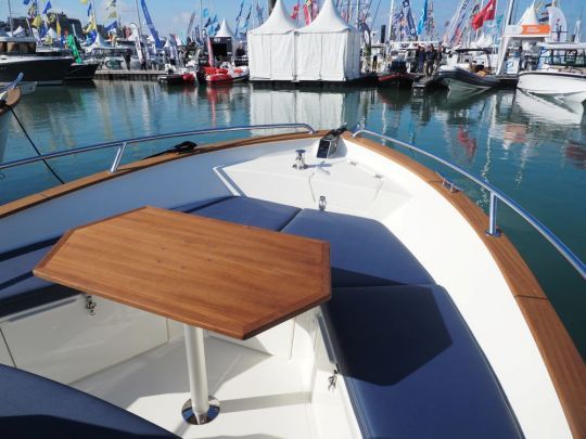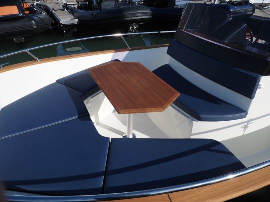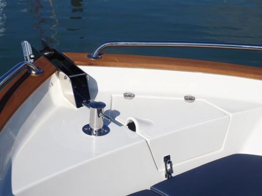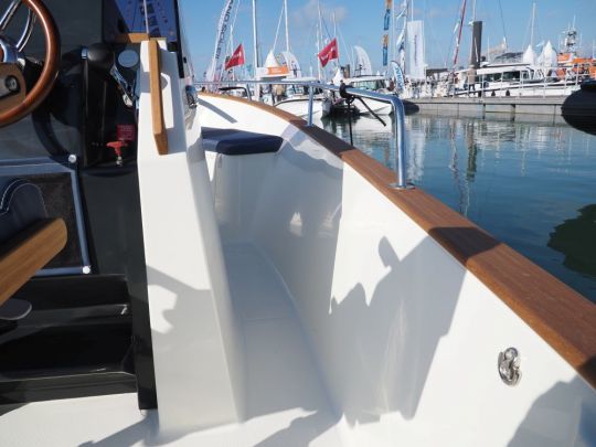 Tout a été pensé pour maximiser la circulation à bord, avec des passavants larges, des mains courantes bien placées, et un accès facile à l'étrave. Un coffre prend place à l'avant, sous la console, avec une prise 12 V et de quoi stocker sacs ou matériel.