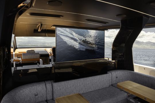 Les deux terrasses latérales rabattables prolongent significativement l'espace de vie à l'arrêt. L'accès à la mer est aussi facilité par une plage de bain immergeable. Côté circulation, les passavants restent protégés par des hiloires profondes. En avant du cockpit, une zone de relaxation est ombragée par un auvent en fibre de carbone au style inspiré des tentes berbères.