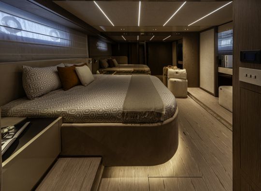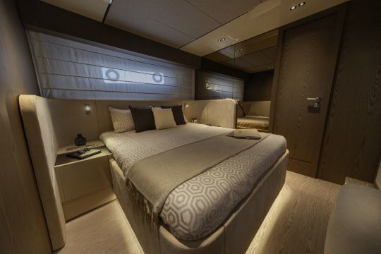 Le plan d'aménagement propose deux cabines (propriétaire et VIP), disposables soit à l'avant, soit au centre du bateau, chacune avec salle d'eau. Une troisième cabine ou une cuisine centrale peuvent être ajoutées en option, tout comme un logement marinier.