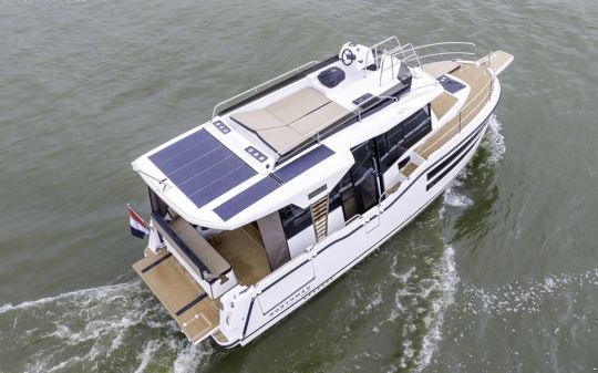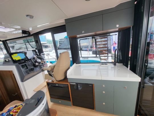L'accès au fly se fait par l'avant, ce qui libère l'arrière du bateau et sécurise les déplacements. Sur le fly, on trouve un bain de soleil et un poste de pilotage optionnel. L'arrière peut recevoir des panneaux solaires, un atout pour l'autonomie énergétique.