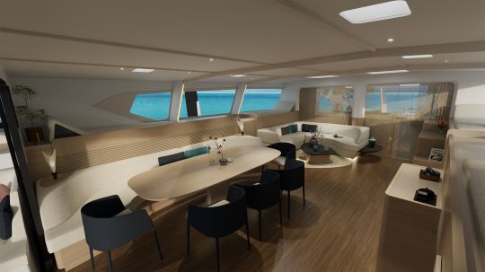 Ce trimaran ne se contente pas d'aligner les chiffres. À bord, les 123 m² d'espace de vie sont intégralement personnalisables. La suite propriétaire de 12 m² avec accès direct au pont, le cockpit de 25 m² et les 160 m² de trampolines en font un véritable loft sur l'eau. Tout a été pensé pour que la circulation soit fluide, les mouvements naturels, et les postes de manœuvre accessibles.