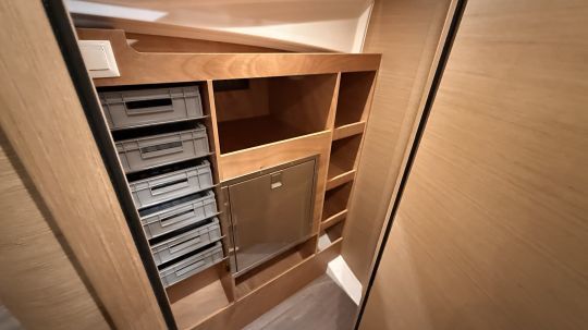 Juste derrière la table à cartes, Jeanneau a installé un grand placard de rangement vraiment malin avec tout ce qu'il faut de tiroir pour stocker vivre ou matériel pour une longue croisière.