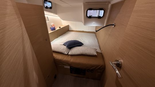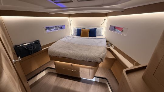 La version visitée au salon était en 3 cabines avec cabine avant propriétaire. Le lit central est accessible par les deux côtés, les rangements sont nombreux et bien placés, et la salle d'eau privée avant comprend une douche séparée. À l'arrière, les cabines sont vastes et bien ventilées, avec ouverture sur le cockpit.