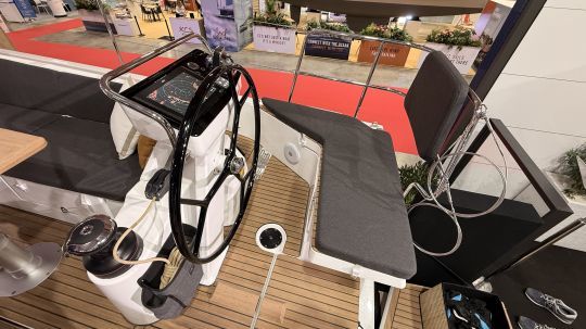 Côté pratique, Jeanneau propose une table à cartes avec un siège de nav' particulier. il s'allonge pour se transformer en sofa/liseuse avec même un petit coussin appuie-tête sur le haut. Essayé au salon cela semble pertinent. A voir à l'usage en mer.
