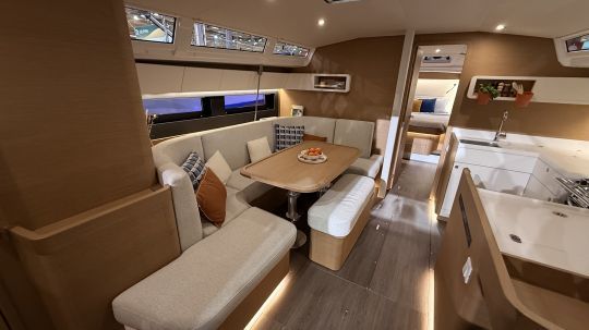 Face à la cuisine, le carré s'articule autour d'une table centrale rabattable et d'assises en vis-à-vis. Le tout est inondé de lumière grâce aux hublots latéraux et de roof. La hauteur sous barrots dépasse 1,95 mètre au centre, ce qui donne une vraie sensation d'espace.