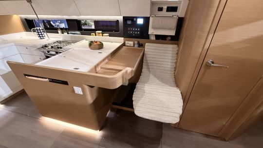 La circulation autour est fluide et le retour du U protège bien le cuisinier. C'est un agencement pensé pour ceux qui vivent vraiment à bord, pas seulement pour sortir les assiettes au mouillage ou au port.