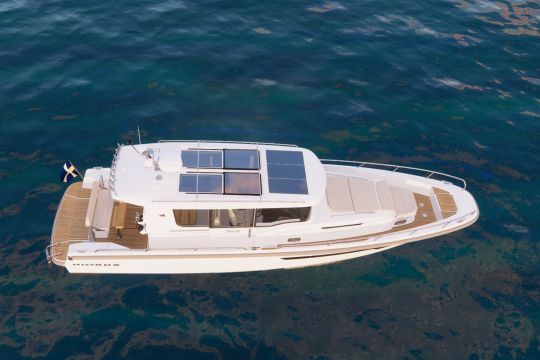 La gamme 12 reprend les bases techniques éprouvées de la série précédente, notamment la carène à double redan avec steps. Elle conserve son seuil de déjaugeage bas, et reste stable à plus de 45 nœuds. Au-delà de la performance, Nimbus a travaillé sur l'ensemble des systèmes : ventilation naturelle, éclairage intérieur, insonorisation, gestion du courant à bord. L'option de climatisation silencieuse sur batterie (grâce à un onduleur) vient compléter l'offre pour les mouillages prolongés.