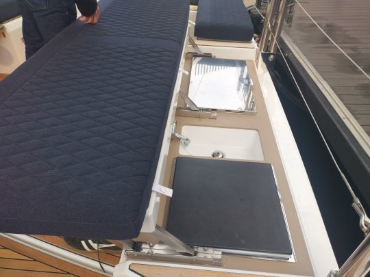 La plateforme de bain impressionne par ses dimensions, proche de trois mètres de large, fermant complètement l'arrière. Elle facilite l'accès à l'eau, aux annexes et aux manœuvres de port. La cuisine extérieure trouve sa place juste au-dessus, assurant ainsi de bons moments au mouillage.