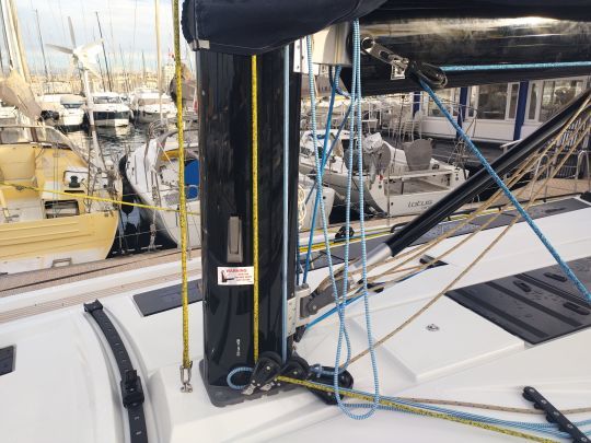 Le gréement standard repose sur un mât aluminium à trois étages de barres de flèche. Les configurations avec grand voile sur enrouleur ou bôme à enrouleur sont également disponibles, ce qui confirme l'orientation croisière du modèle.