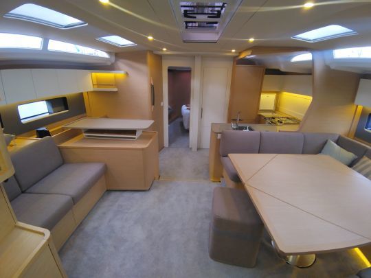 Sous le pont, le Dufour 54 mise sur la lumière naturelle, les surfaces claires et une bonne ventilation. Les nombreux panneaux de pont assurent un apport d'air et de lumière appréciable au mouillage comme en navigation.