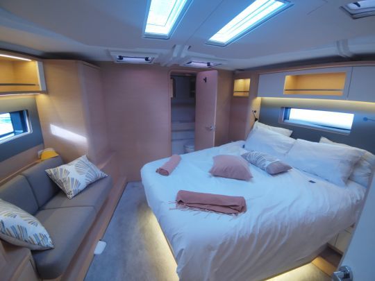 La cabine avant se décline en deux versions distinctes. La Master Suite propose un lit îlot disposé en biais et une salle de bain avec douche séparée à l'avant. La Master Cabin conserve un lit central avec douche et toilettes séparées. Deux approches différentes, selon que l'on privilégie l'espace ou la symétrie.