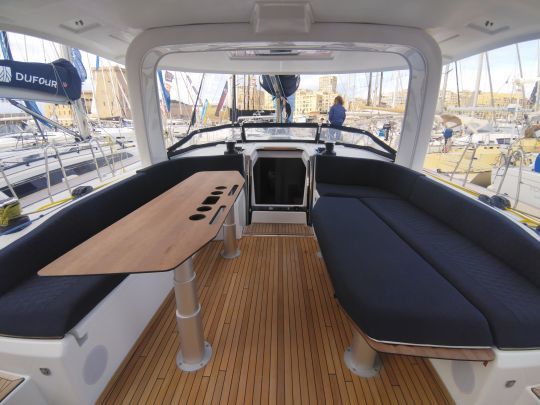 Le Dufour 54 reprend les grandes lignes du Dufour 48, déjà connu pour son cockpit ouvert et sa circulation fluide. Le principe reste le même, mais transposé à une échelle supérieure. Les espaces gagnent en largeur, les volumes en cohérence, et la sensation de plénitude est agréable dès l'embarquement.