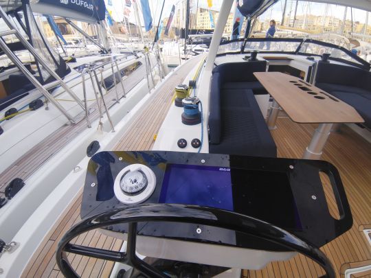 Les postes de barre restent bien dégagés, avec une bonne liberté de mouvement pour le barreur. En configuration standard, les manœuvres sont ramenées à l'avant de la descente. Les winchs d'écoute sur les hiloires arrière restent disponibles en option pour ceux qui privilégient un pilotage plus direct depuis l'arrière.