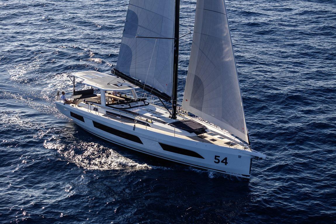 Le Dufour 54 marque une nouvelle étape dans la gamme du chantier français. Avec près de 17 mètres hors tout, il s'adresse clairement aux programmes de grande croisière, familiale ou en équipage, sans rompre avec les choix de conception déjà vus sur les modèles plus compacts.
